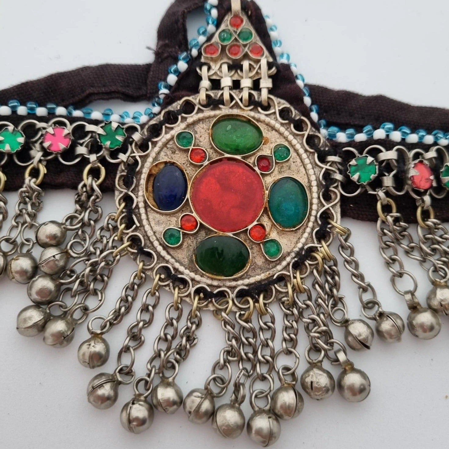 These one-of-a-kind Kuchi tribal headpieces feature metal chains, bell dangles, bead detailing and jewelled medallions. Black cotton bands and cotton backing make this headpiece comfortable and easy to wear. Also looks amazing as a hat band!Â