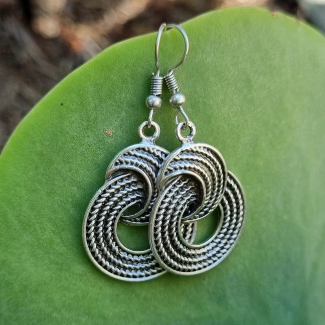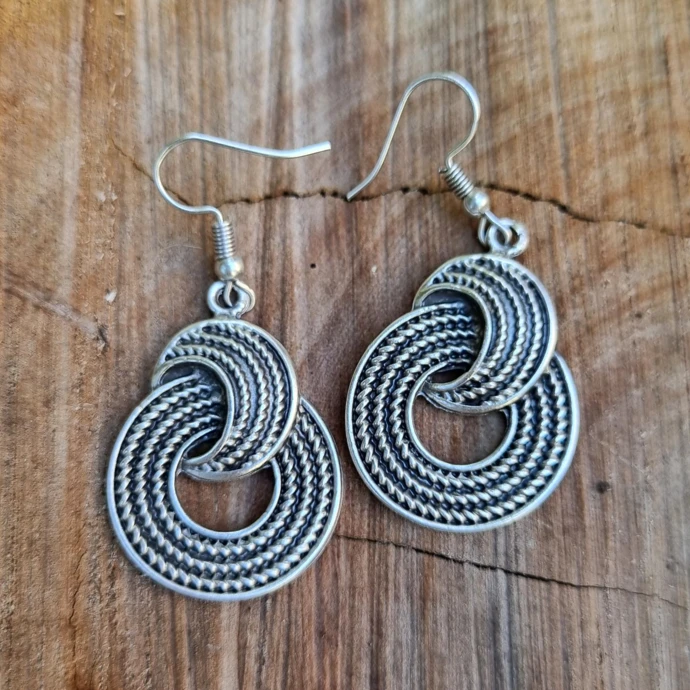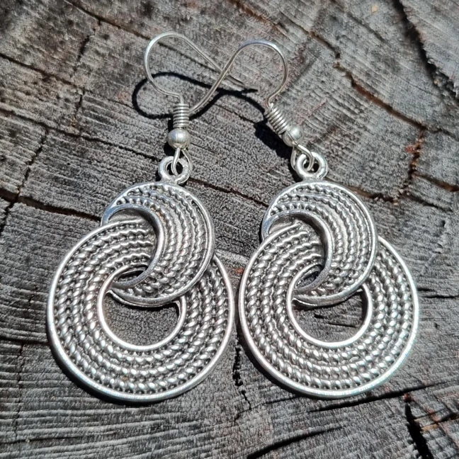 Celebrate everyday chic style with our beautiful Bella Earrings, featuring two intersecting circles adorned with an intricate rope pattern, set on Shepherd’s hooks.Â