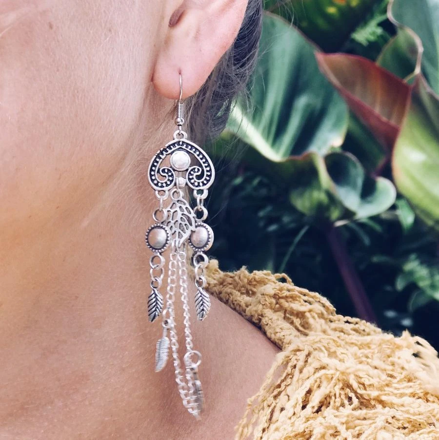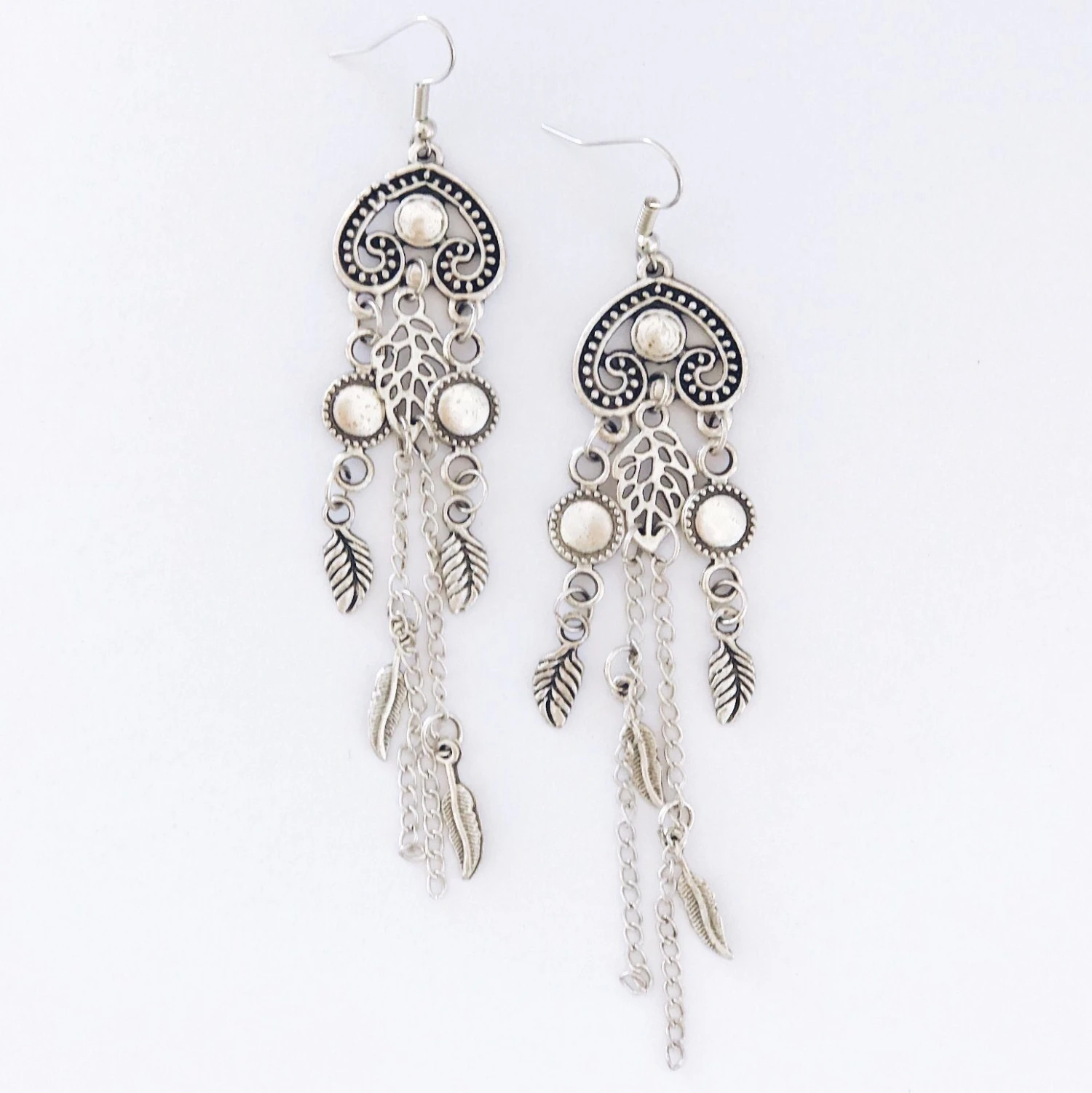 Our enchanting Dreamcatcher Earrings feature dangling feather fringes and curled ribbons in a black and bright shine finish, adding an Old World vintage influence.