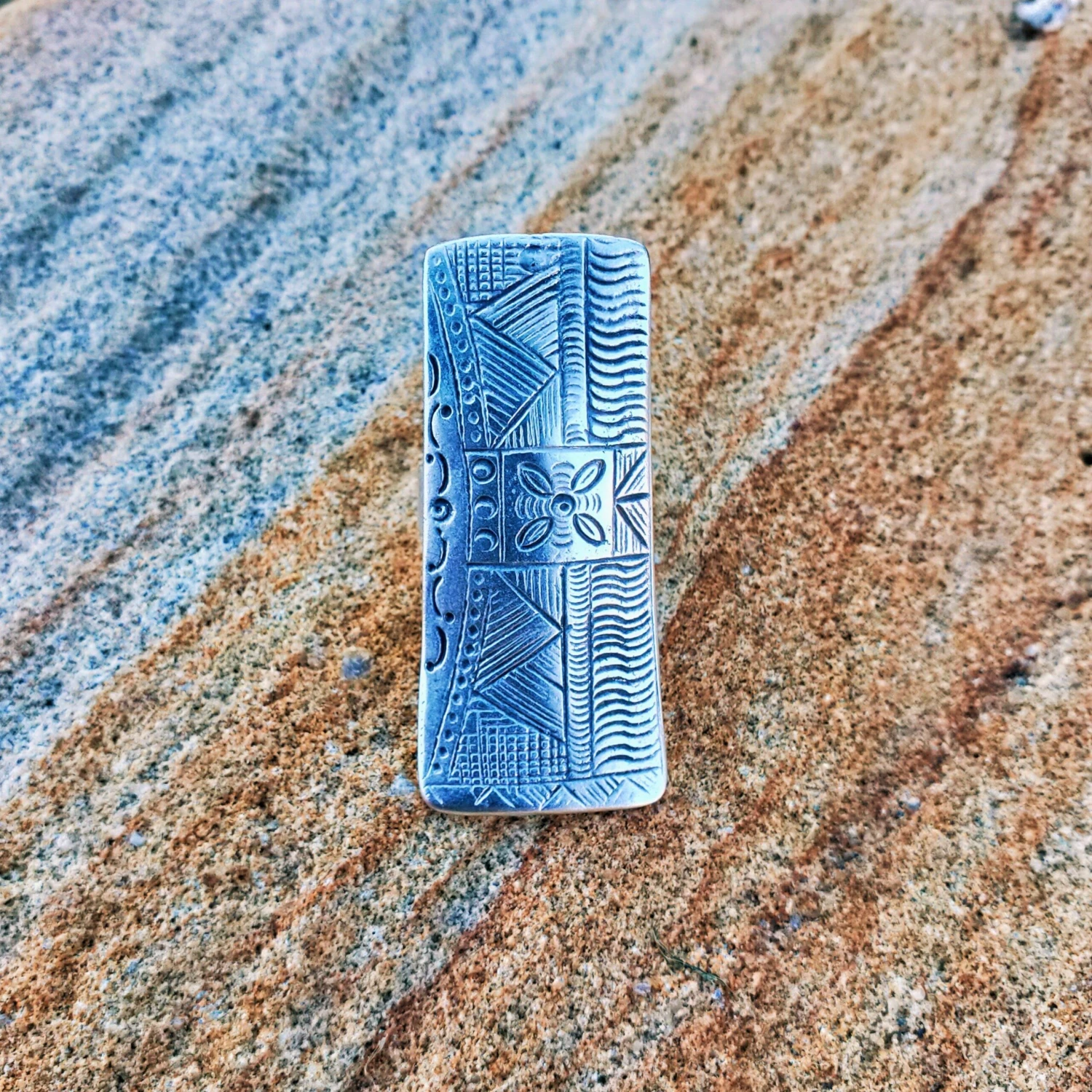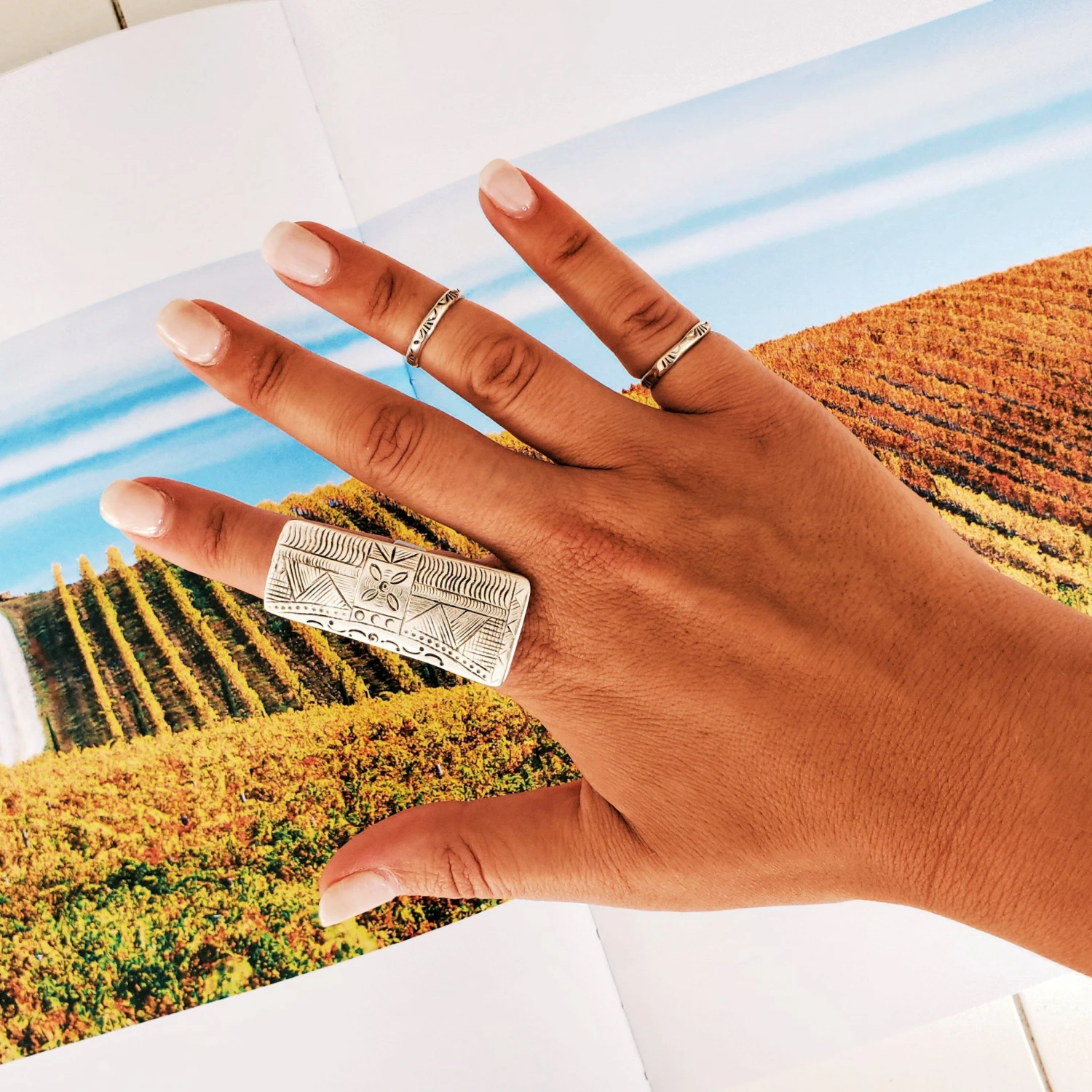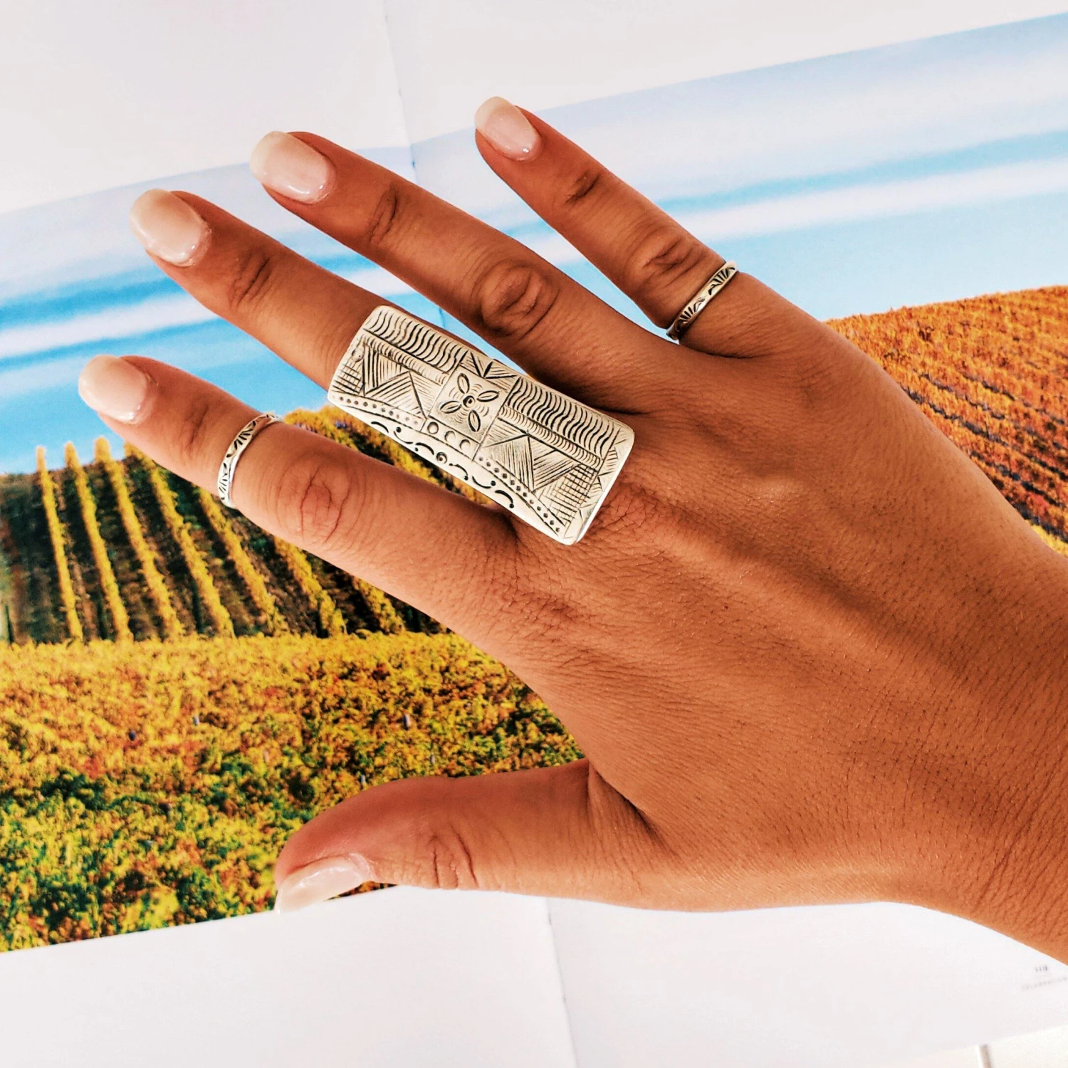 A highly engraved finish on the top of a flat rectangular tablet gives this ring luxury and joy for those who love statement-worthy bold designs.Â