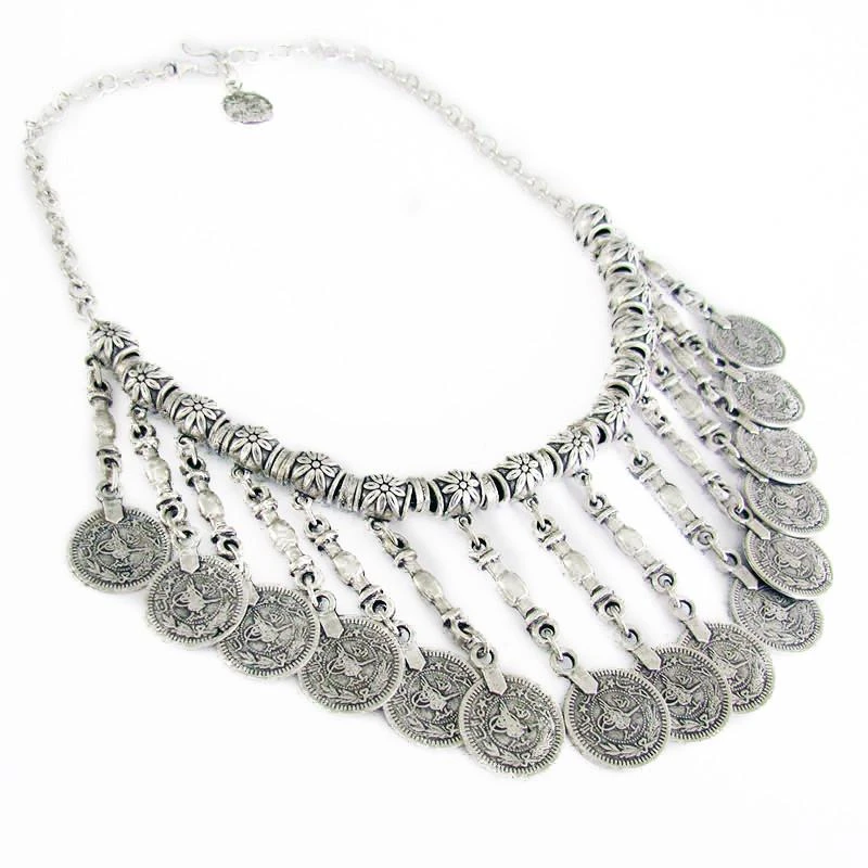 Uplift your wardrobe and mood with our chandelier Ani Necklace with Coins, featuring flower links symbolizing change and growth.