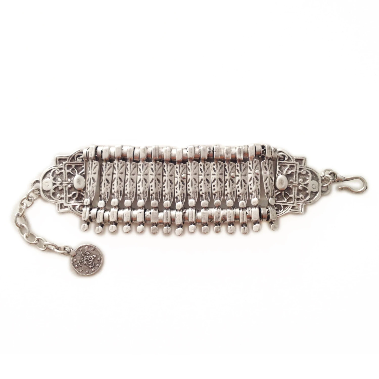 A stunning silver plated bracelet from our beautiful Anatolian collection, with hook and ring closure. Handcrafted in Istanbul by local artisans. Pair with our Ankara necklace.Â