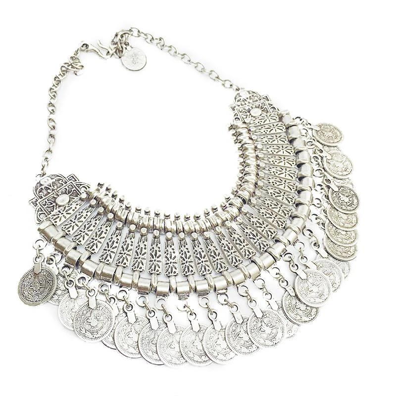 Add the finishing touch to your look with this statement necklace featuring chandelier drops of medallion coins and round tubular beads with elongated filigree elements.