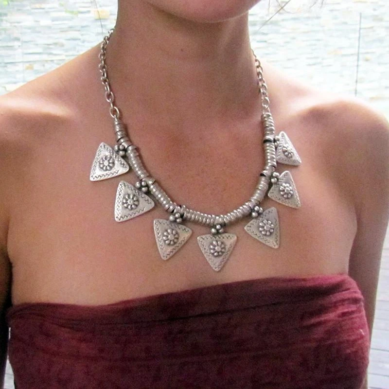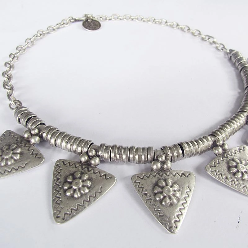 The pyramid shape has long been associated with ancient wisdom, power, and spiritual connection. The angles of each pyramid are thought to represent the flow of energy, channeling ancient knowledge and inner strength. Paired with intricately textured flowers, the necklace evokes a sense of new beginnings and exciting life paths.