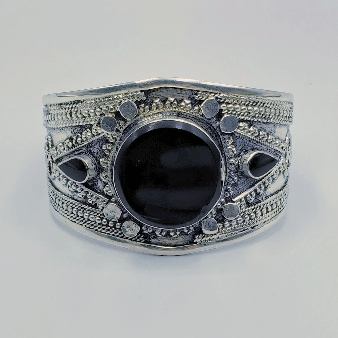 A gorgeous Kuchi tribal cuff featuring green coloured stones. These cuffs have a smaller width than our other large statement cuffs, making them really easy to wear and add a touch of tribal style to any outfit!Â