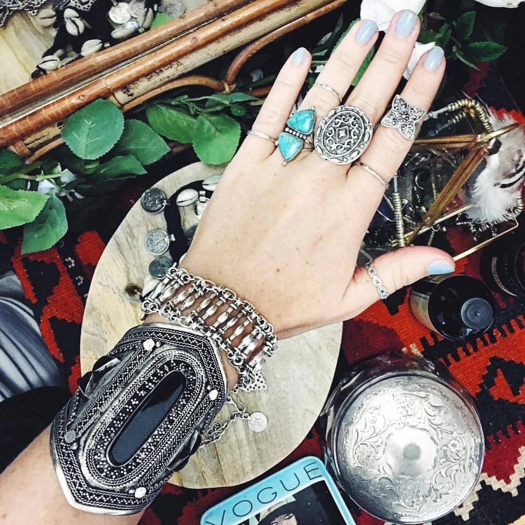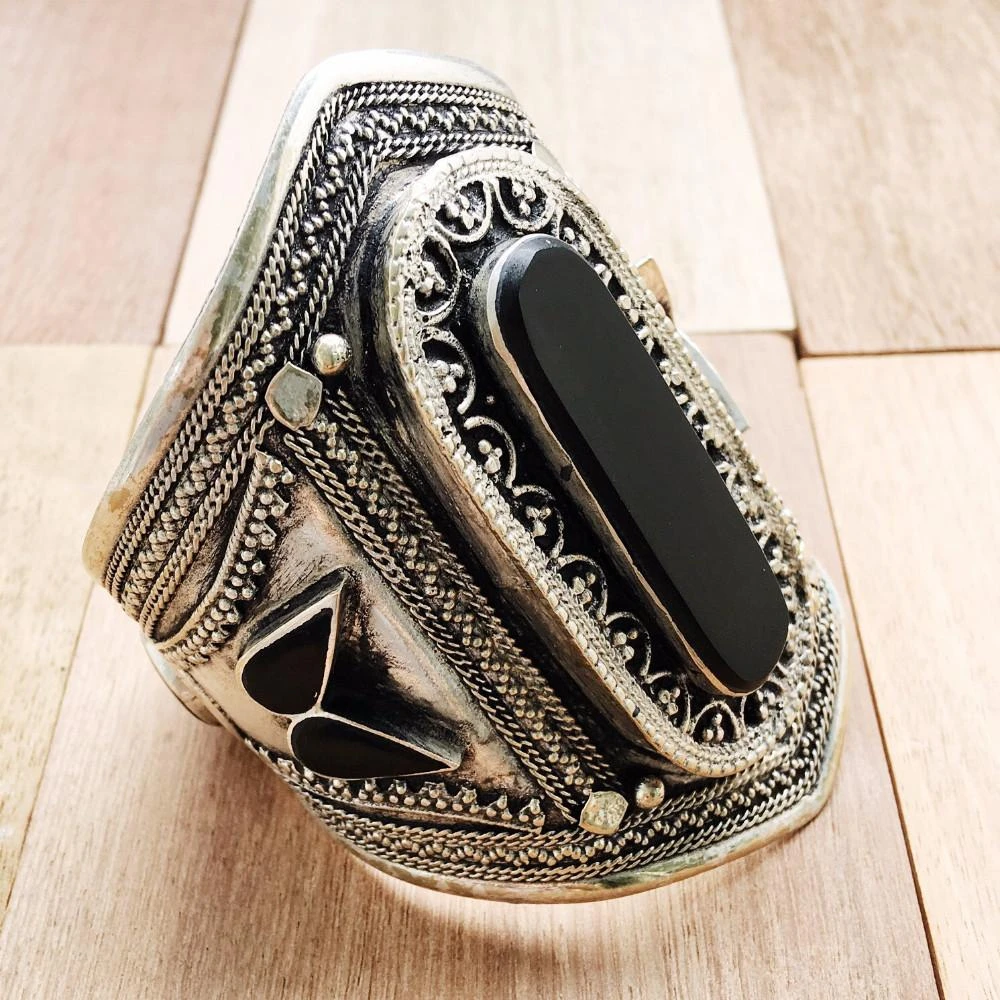A stunning Kuchi tribal cuff featuring a large moody black stone and hand engraved markings. A statement piece to add to your tribal collection!