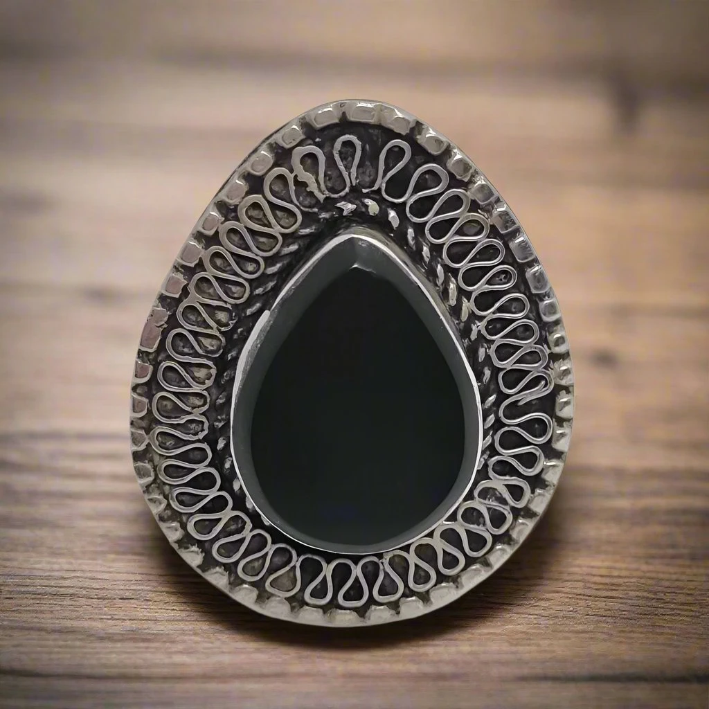 This ring features a stunning tear dropped shaped black coloured stone, surrounded by detailed patterning. Bring out your inner bohemian with this gorgeous statement ring.Â