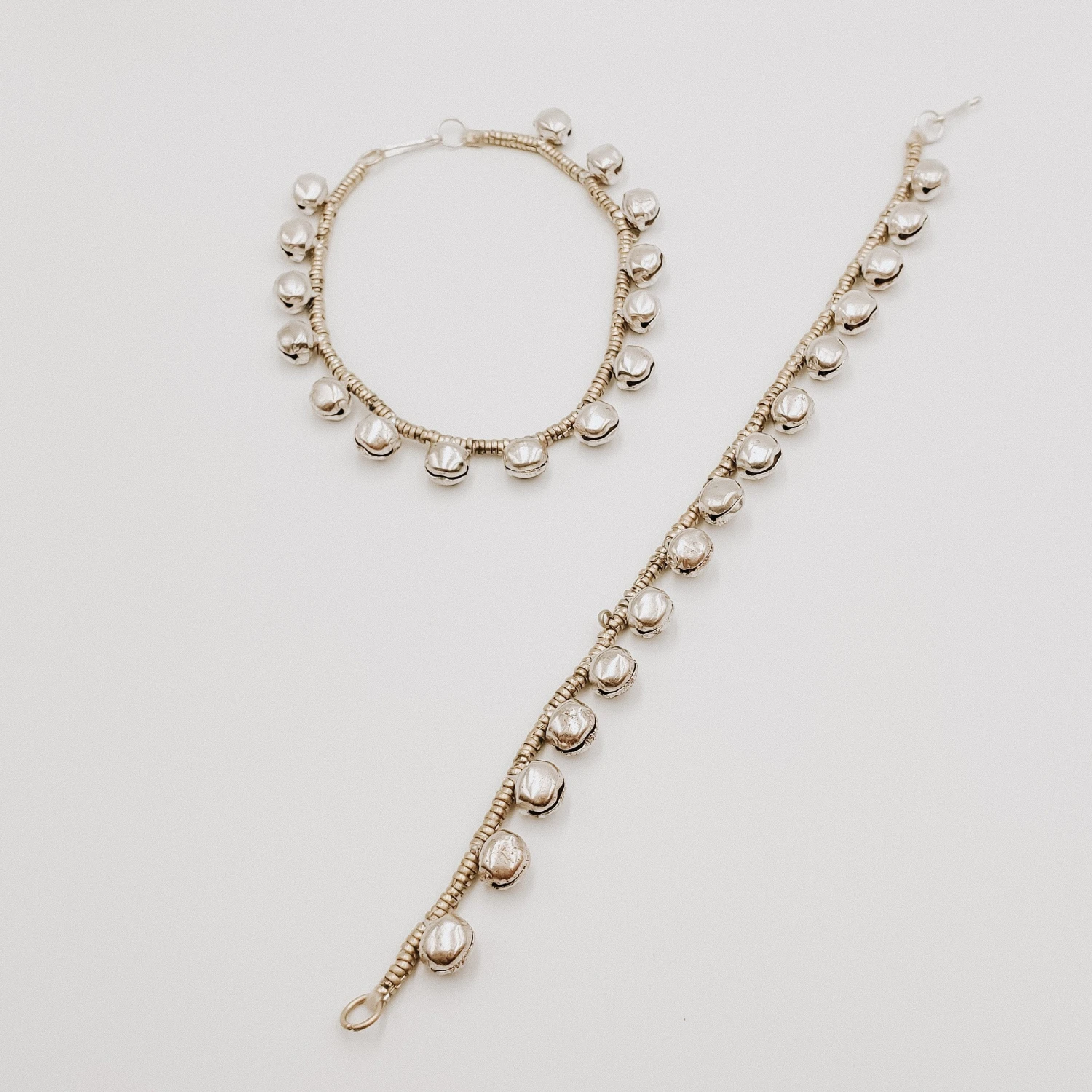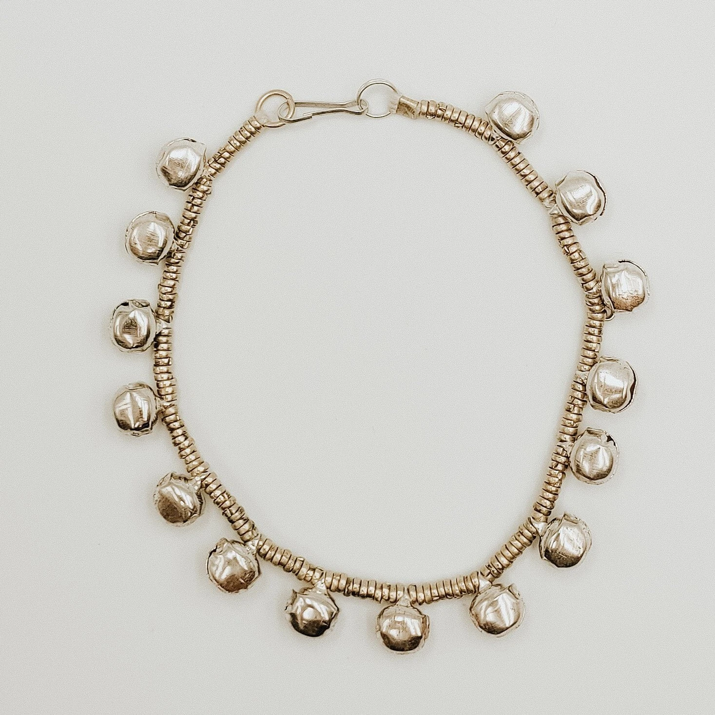 A simple boho anklet with golden tones featuring a row of bells that jingle as you walk.