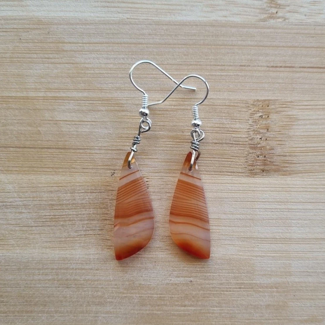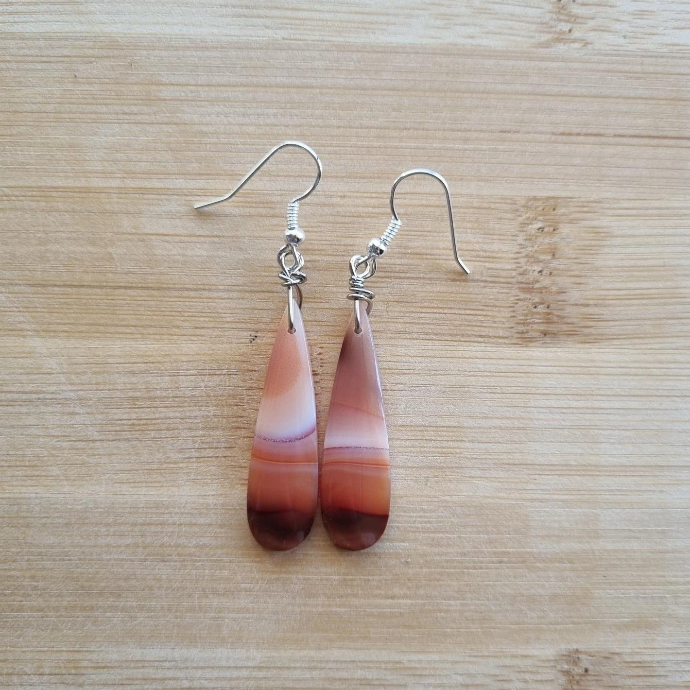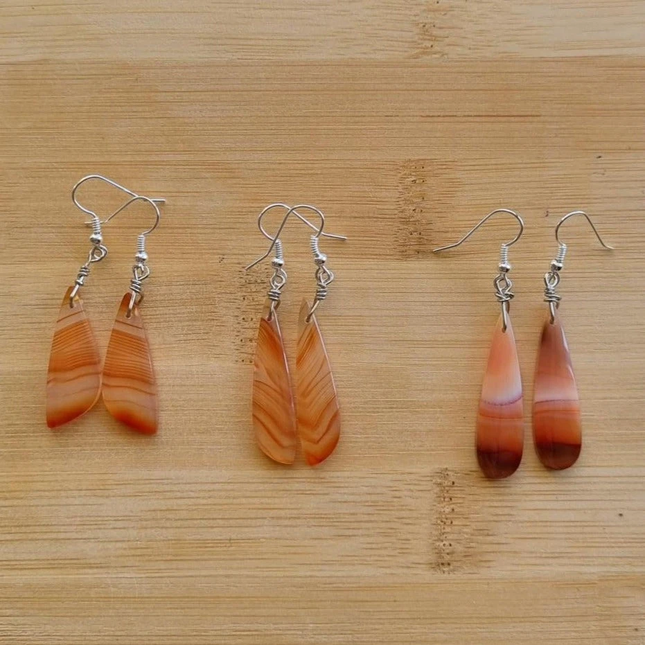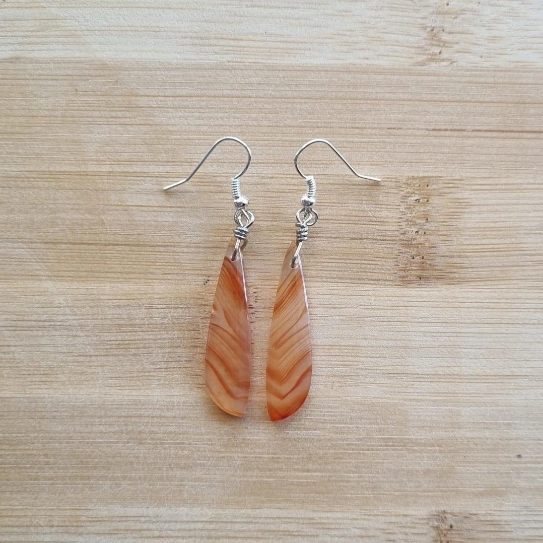 These gorgeous Carnelian stones were mined from raw materials in various islands throughout Indonesia. The stones were then cut, trimmed and polished to give them a beautiful shiny coating, and made into individual earrings. The stones were then drilled, wire wrapped and attached to silver earring hooks to bring you a unique and exquisite piece of wearable art.