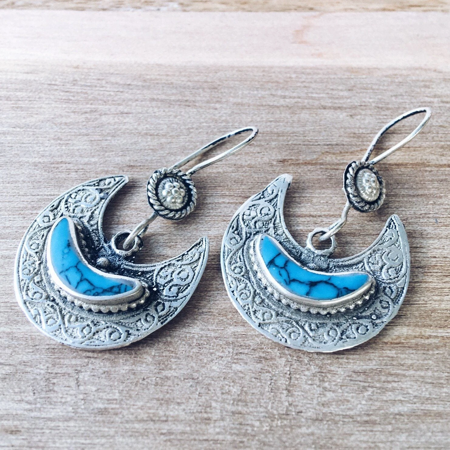 Elevate your style with these exquisite handmade Kuchi Tribal Earrings, inspired by traditional craftsmanship and artistry. Each earring showcases a beautifully engraved crescent-shaped silver design, meticulously crafted to reflect the unique heritage and elegance of tribal jewellery. The striking blue stone at the center adds a bold contrast, enhancing the intricate detailing and lending a touch of mystery and sophistication to the piece.