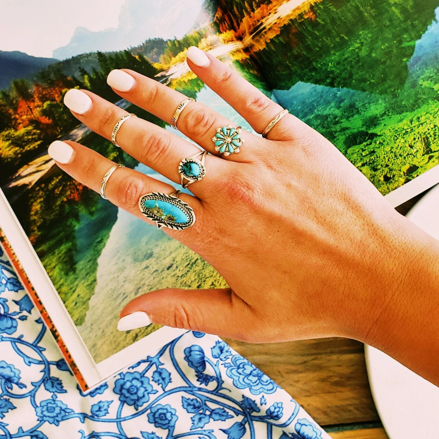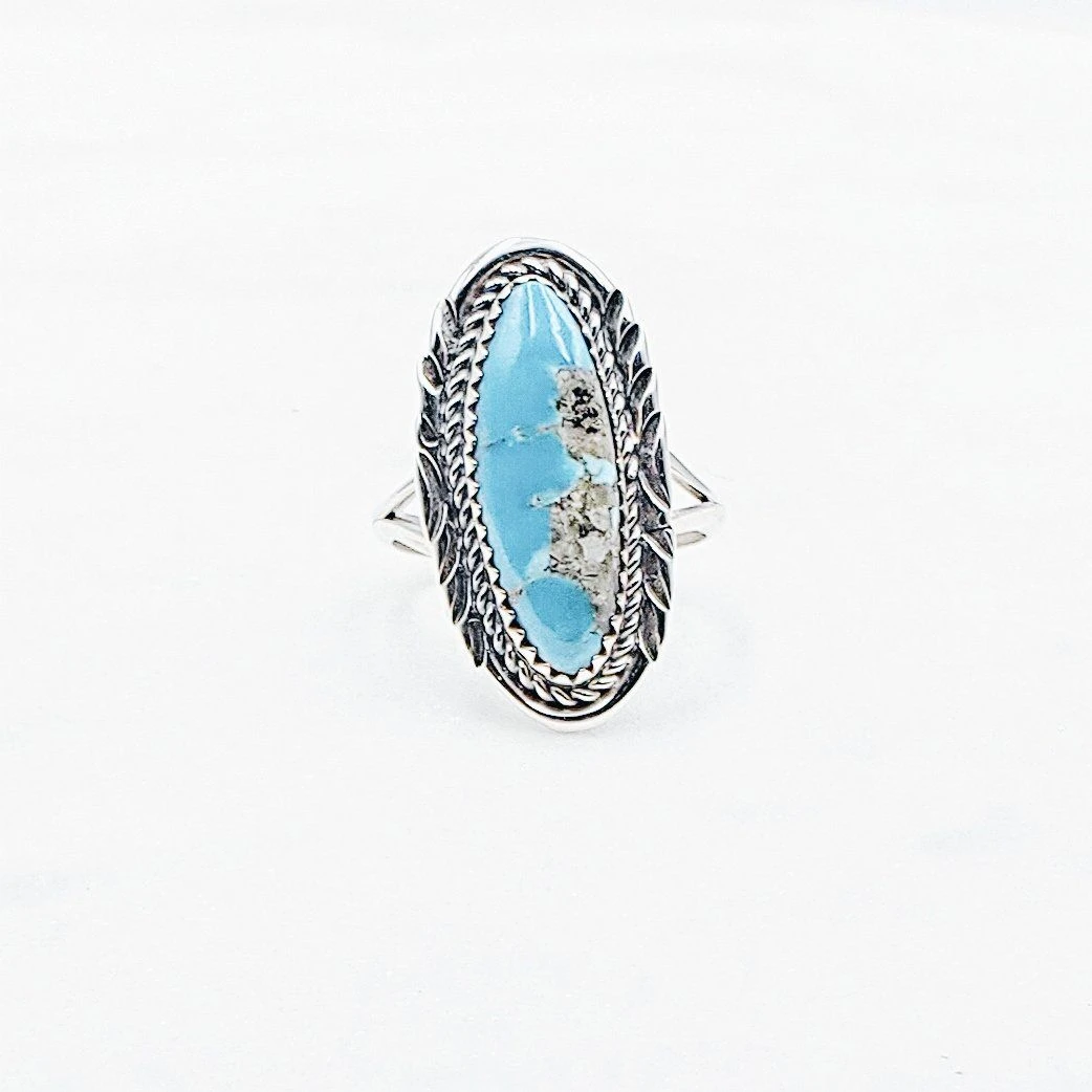 A stunning handcrafted Native American Navajo ring features a Kingman* turquoise stone, with beautiful sterling silver detailing and split shank band. This statement ring can be worn on its own or with your other favourite turquoise pieces.Â