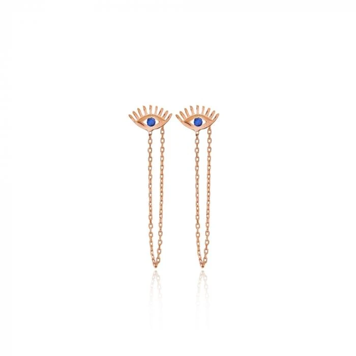 Our stunning Evil Eye chain earrings feature a delicate chain linking the evil eye symbol to the back stud. The chain dangles down from the ear. Handcrafted in Istanbul.