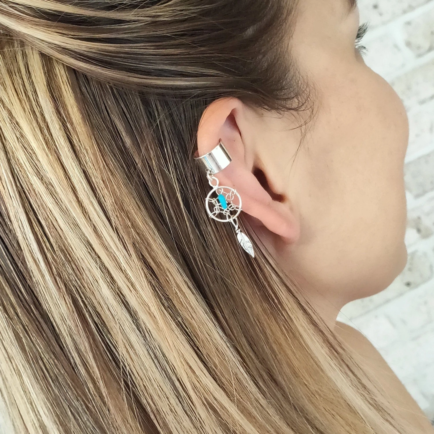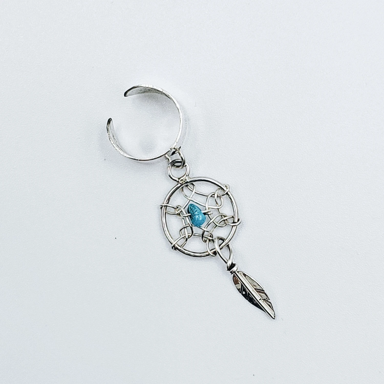 Handcrafted Native American Navajo ear cuff. This sterling silver ear cuff, features a hand made feather that dangles from the dreamcatcher cradling a small Sleeping Beauty* turquoise nugget above.  Adjustable size – squeeze to fit around top rim of your ear.