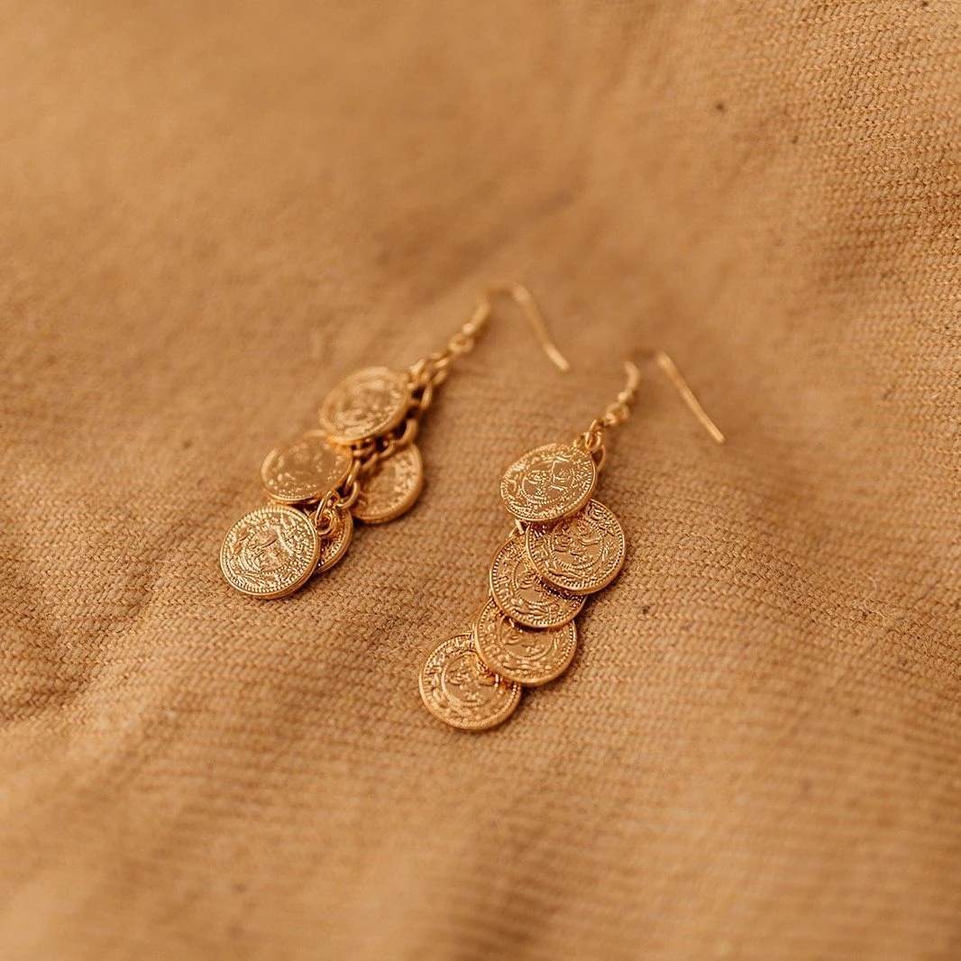 Our slinky Gold Anatolian Earrings – “Turkish Coins” featuring a jumble of ancient-influenced coins with bright shine and attention to detail with engraved patterns. Each coin is set on a ring chain link, giving these pretty earrings length and movement. Shepherd’s hooks keep them in place.