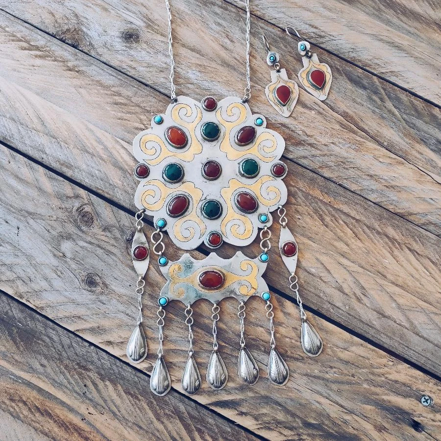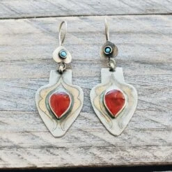 Stunning handmade Turkmen Teke earrings featuring engraved silver etchings with gold gilding. There is a round carnelian stone in the centre. This hangs from a reversed heart shape featuring a small turquoise stone piece.