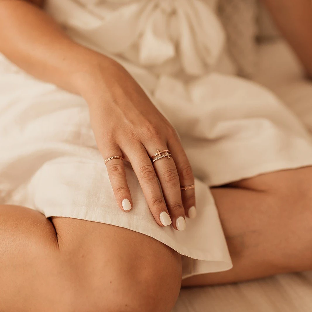 Add your everlasting faith to your stacked ring collection with this unique design, finely crafted in a rich shine. Sparkling round brilliant cut zircons on one side lend a luxurious touch to this intersecting cross double stacked band. Mix and match this chic ring with other jewellery for a touch of faith-filled meaning.