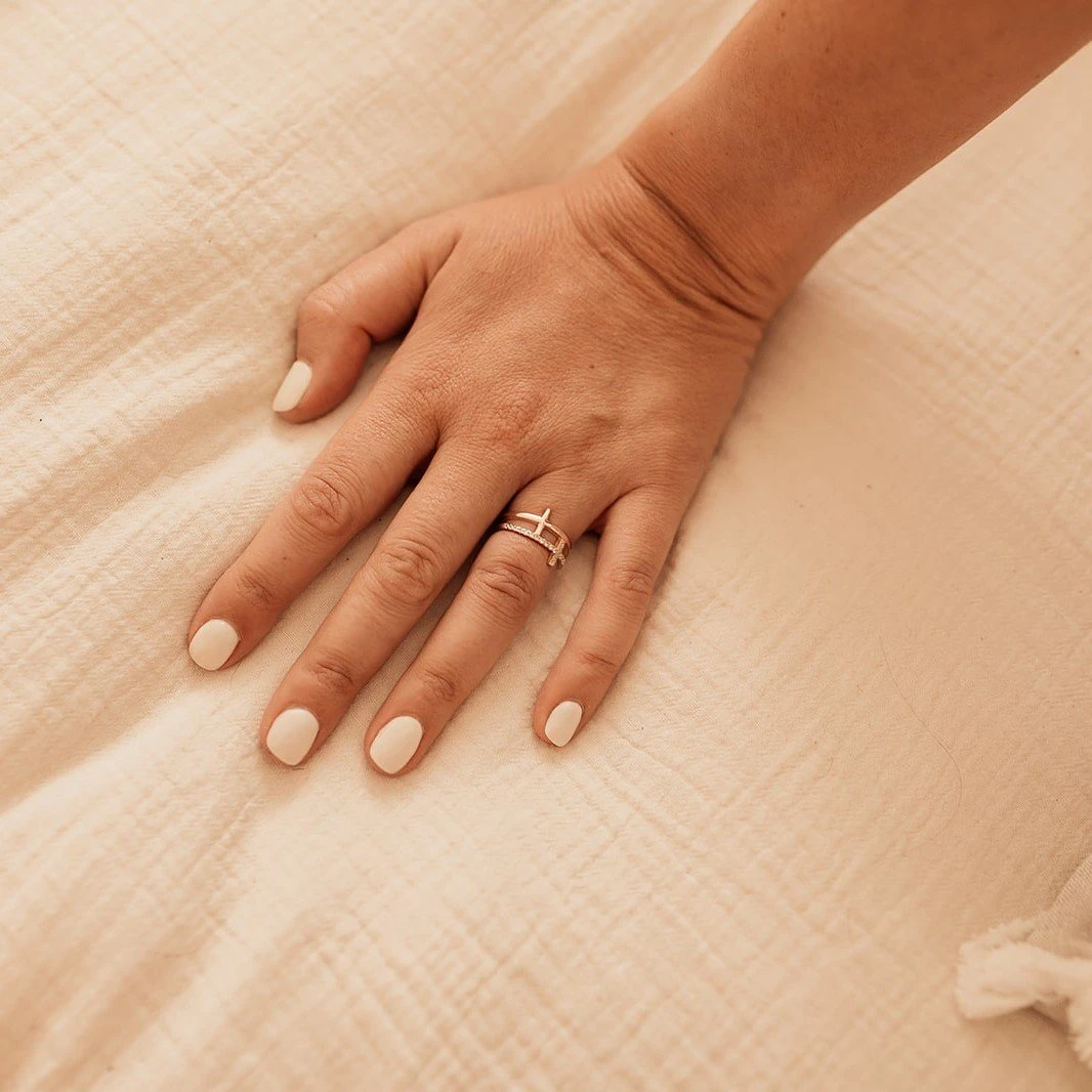 Our Sterling Silver Gold Plated Sunbeam ring features 2 bands joined at the back. One band is set with Zircon gemstones and compliments the other plain band perfectly. Our Golden Sunbeam Ring is delicate enough to be stacked with other rings or worn on its own, you choose your own style!
