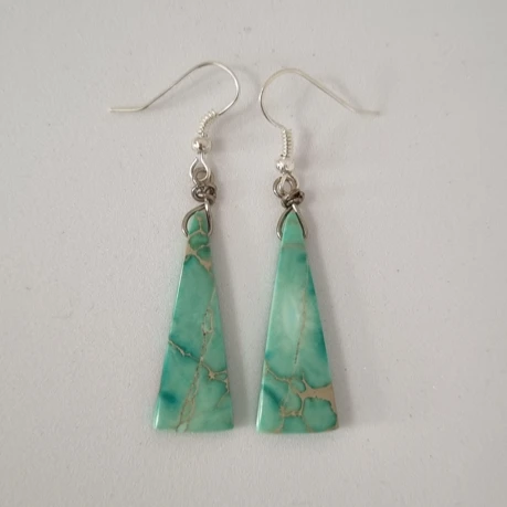 These green sediment turquoise stones were mined from raw materials in various islands throughout Indonesia. The stones are then cut, trimmed and polished to give them a beautiful shiny coating, and made into individual earrings. The stones are then drilled, wire wrapped and attached to silver earring hooks to bring you a unique and exquisite piece of wearable art.