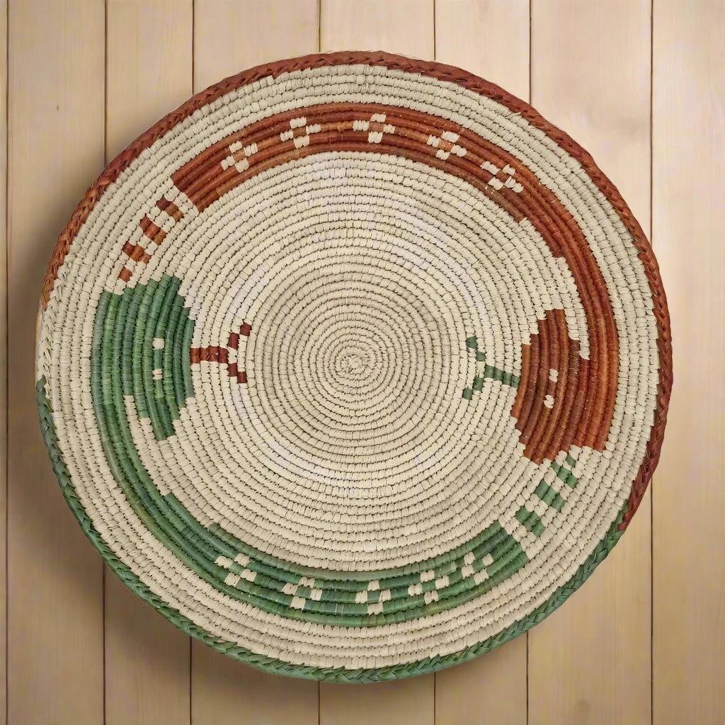 The natural date palms fiber is dyed and tightly woven to create a tribal pattern, featuring earthy orange, green and natural tones.