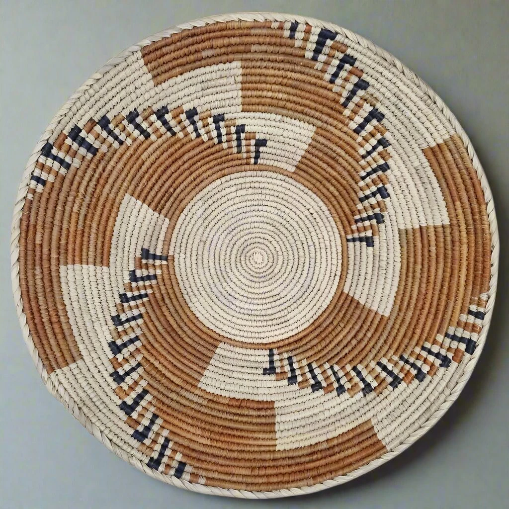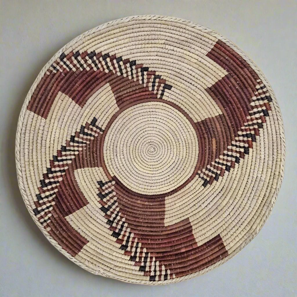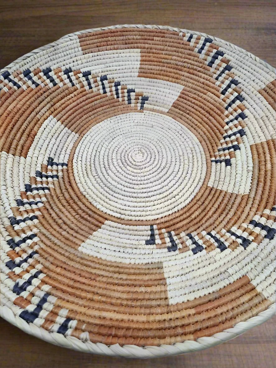 The natural date palms fiber is dyed and tightly woven to create a tribal pattern, featuring earthy browns, greys and natural tones.