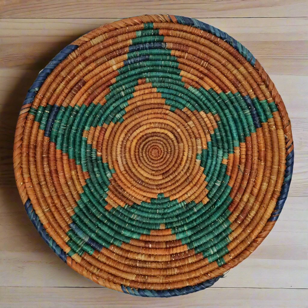 The natural date palms fiber is dyed and tightly woven to create a tribal pattern, featuring earthy orange, green and blue tones.