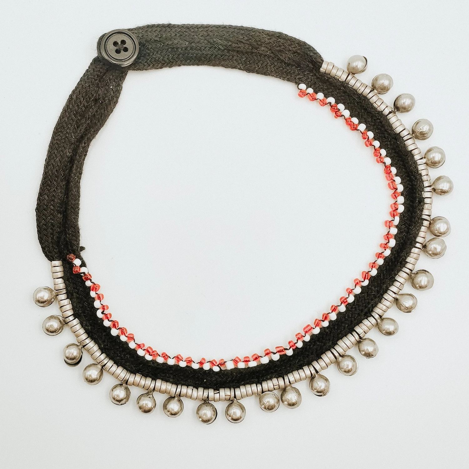 Crafted with intricate detail, this Kuchi Tribal Choker features droplet bead-balls and a woven two-tone design that exudes a sense of artisanal charm. The triple layer of stylistic inspiration adds depth and dimension to this statement piece, making it a versatile addition to your jewellery collection. Handmade from a soft material with summary closure at the back of the neck.