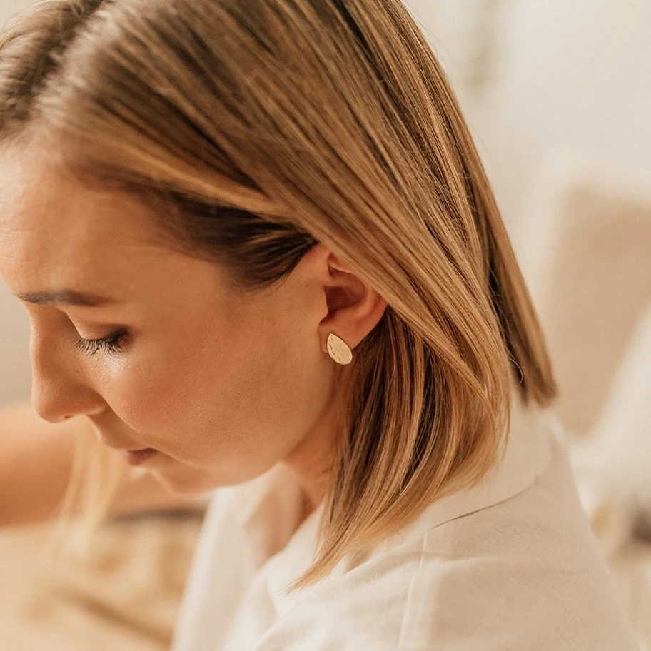 Model is wearing our Rose Gold Pressed Metal Earrings
