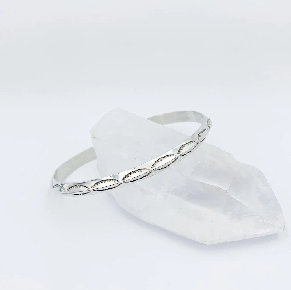 This stunning, solid sterling silver bracelet is a handcrafted piece of art, made by talented Native American Navajo artisan, Ida McCrae. Featuring a sleek 6mm wide band, this bracelet is beautifully adorned with intricate hand-stamped detailing that reflects traditional Navajo craftsmanship. Every detail is carefully etched into the silver, offering a unique and authentic representation of Navajo heritage and artistry.