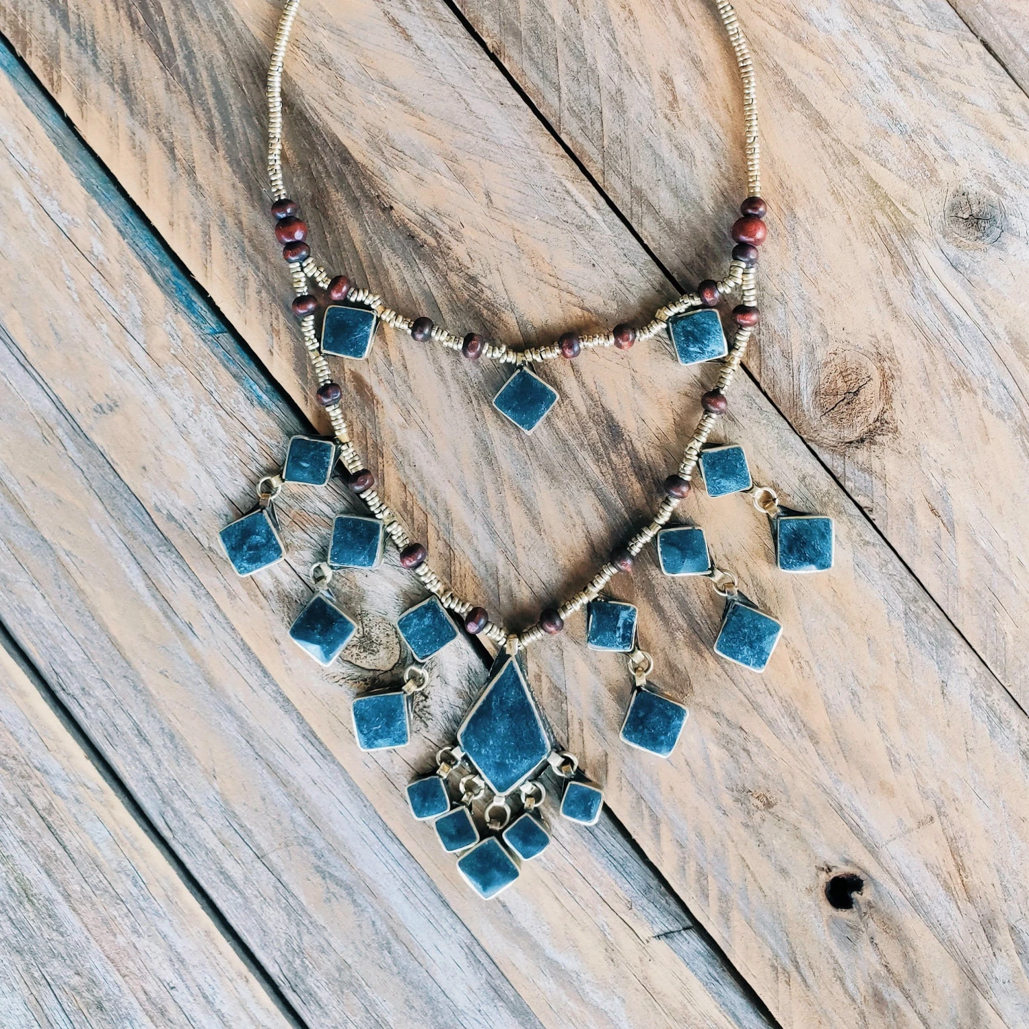 Raindrop colorful gemstone squares fall in a graceful pattern with our Tribal Diamond Shaped Black Stone Necklace, featuring a unique mesh web of stones with wooden and metal alloy beads.
