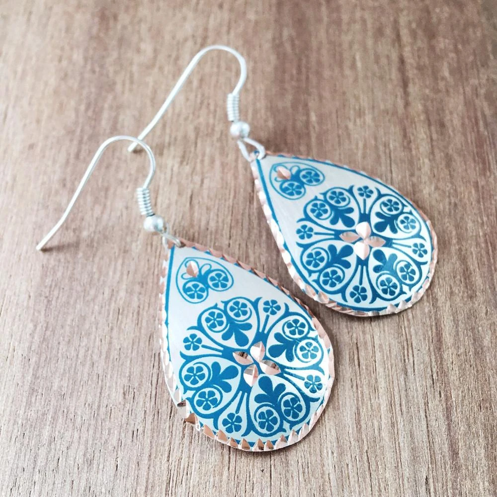 Add our Turkish Copper high-quality artisan earrings to your year-round wardrobe, featuring an illuminating, warm rustic copper and gorgeous blue and white enamel design.