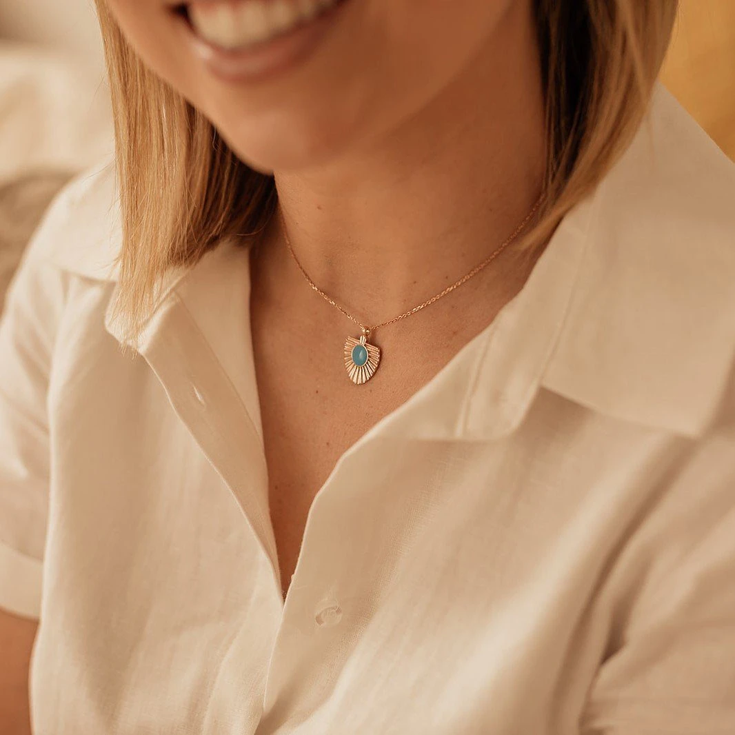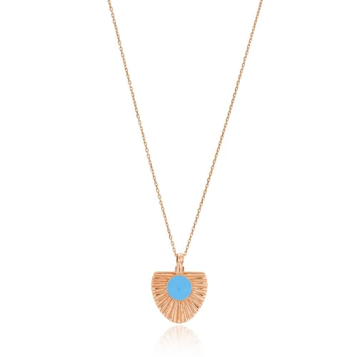 This delicate necklace features a turquoise coloured stone surrounded by rose gold plated sterling silver sun rays. Finished on a rose gold plated chain with a lobster clasp. Wear on its own or layer it with other rose gold chains.