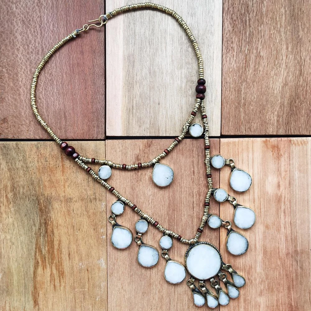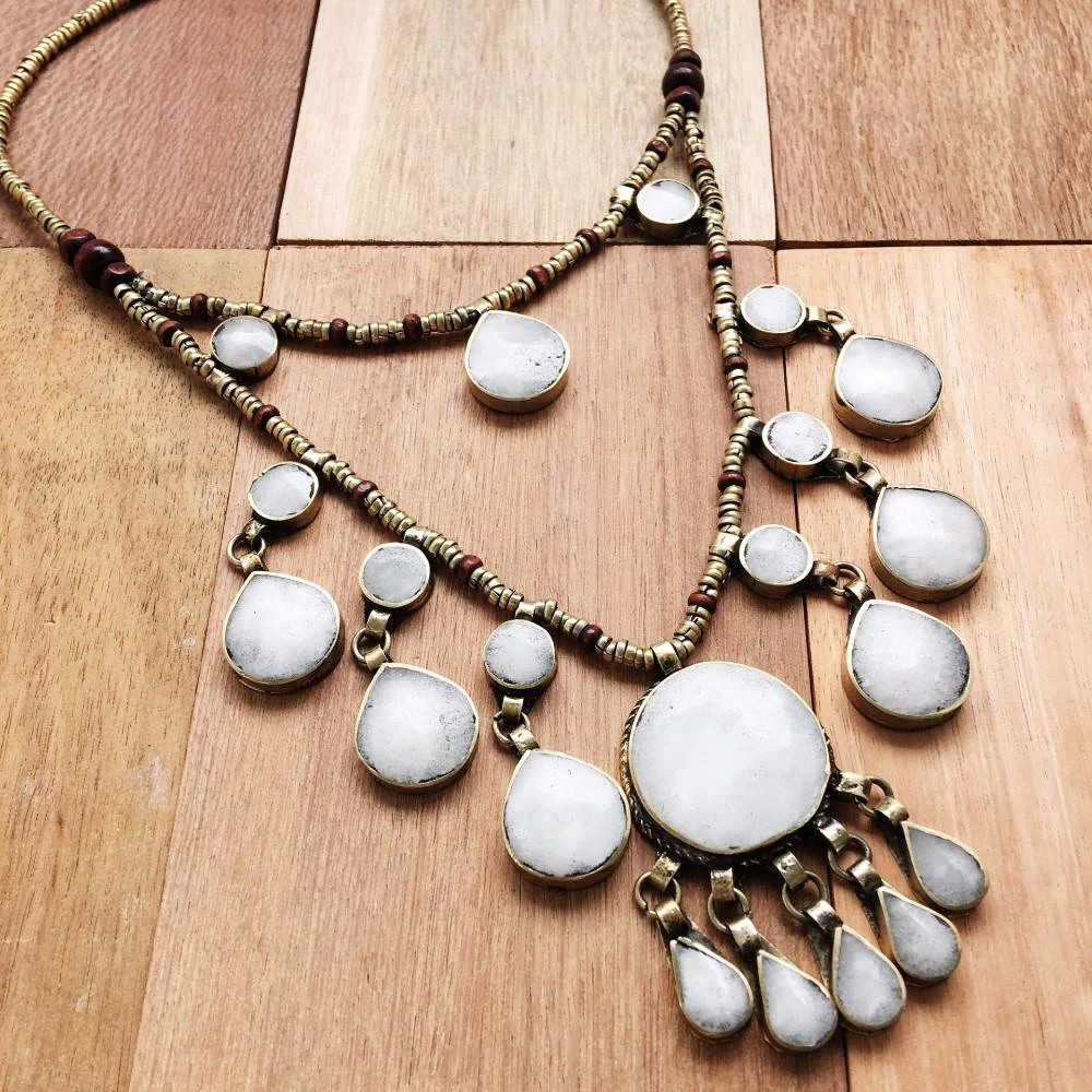 Make our custom made Two Tier Tribal Grey Stone Necklace your ultimate selection for a statement necklace featuring a decadent display of beautiful white/gray stone pendants.